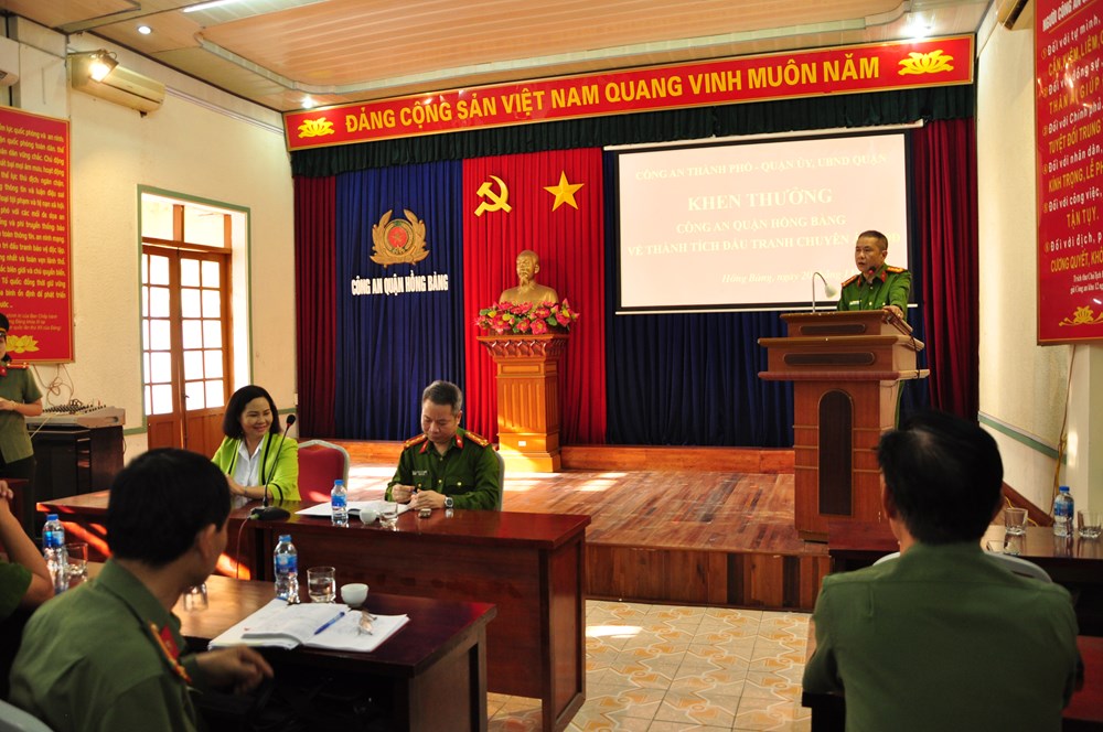 Thay mặt ban Giám đốc, Đại tá Lê Nguyên Trường, Phó Giám đốc Công an TP.Hải Phòng đã biểu dương kết quả đấu tranh chuyên án của Công an quận Hồng Bàng.