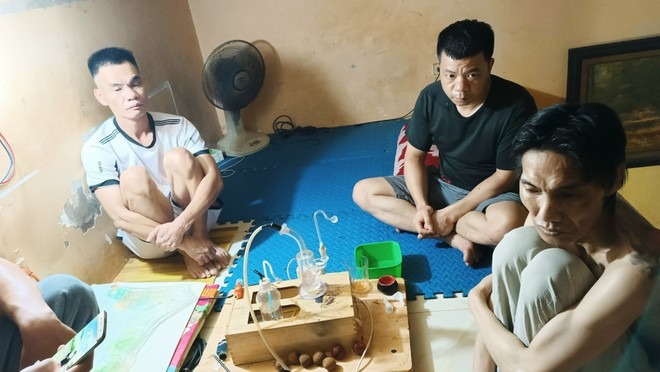 Kiểm tra khu vực gác xép, lực lượng Công an phát hiện quả tang 3 đối tượng nêu trên đang có hành vi sử dụng trái phép chất ma túy; vật chứng thu giữ 2 bộ dụng cụ sử dụng ma túy tự tạo có gắn coóng thủy tinh đều bám dính ma túy loại Methamphetamine.