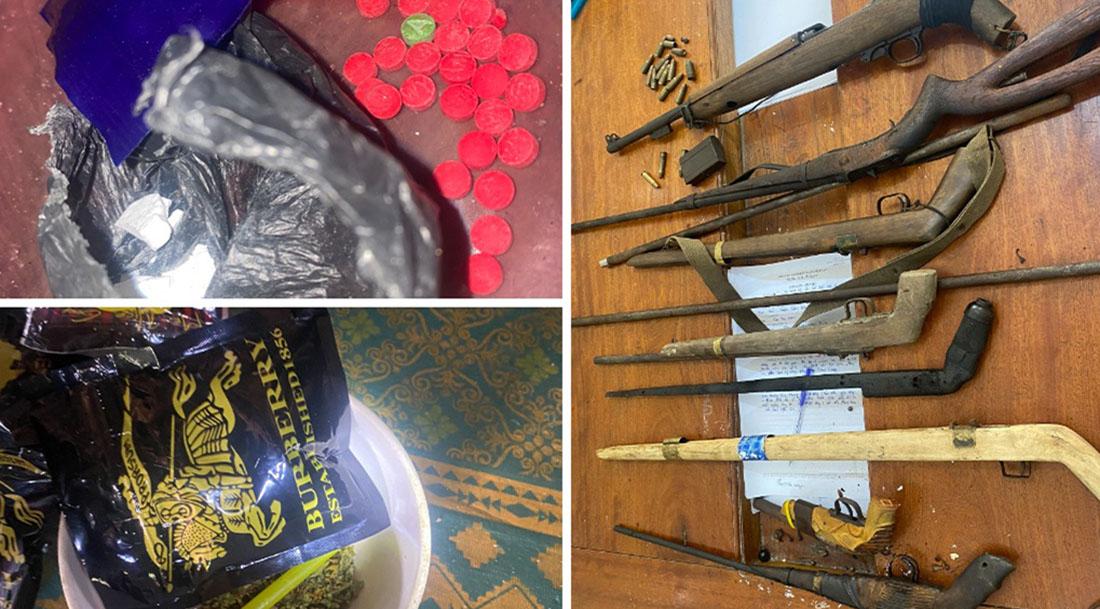 Tang vật thu giữ gồm 1 vũ khí quân dụng, 17 viên đạn, 7 khẩu súng tự chế và 50 viên ma tuý tổng hợp, 2,5gam hêrôin.