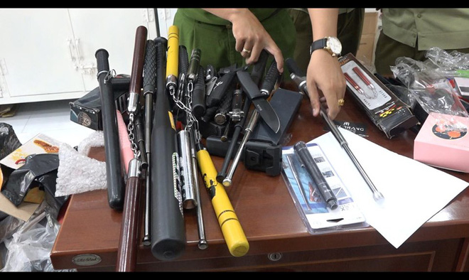 Bên cạnh đó, cơ quan chức năng còn phát hiện nhiều công cụ hỗ trợ như côn sắt nhị khúc, gậy sắt, và các loại dao nhưng không xuất trình được giấy phép, hóa đơn.