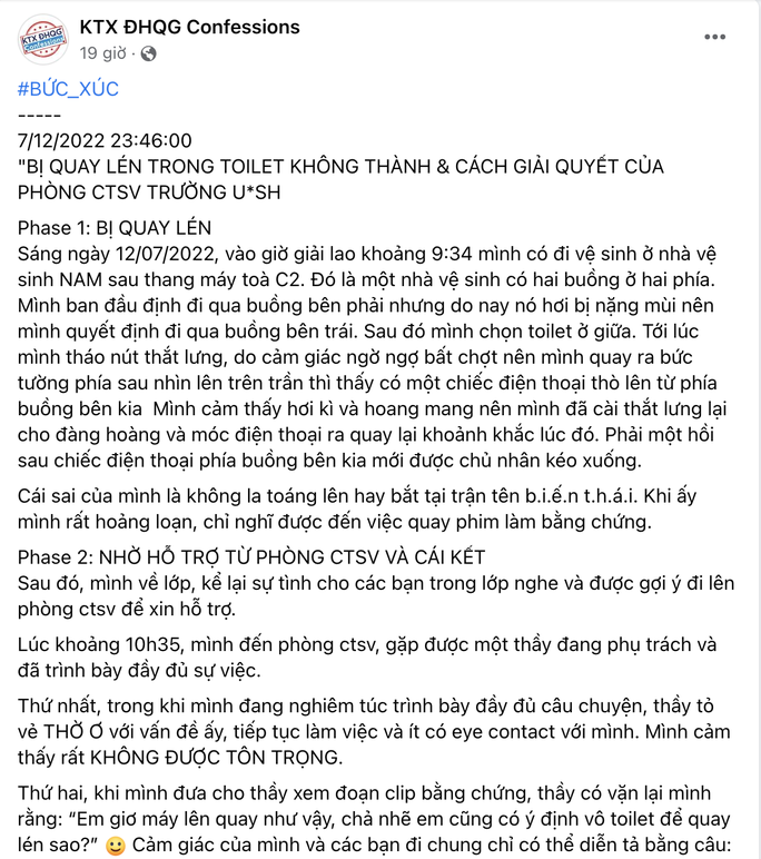 Trước đó, Facebook KTX ĐHQG Confessions đăng tải bài viết ẩn danh của một nam sinh về việc bị quay lén bằng điện thoại trong nhà vệ sinh. Nam sinh này đã ghi lại bằng chứng và phản ánh lên Phòng Công tác sinh viên của trường. Nhưng, người tiếp nhận vụ việc lại có thái độ thờ ơ và chất vấn ngược.