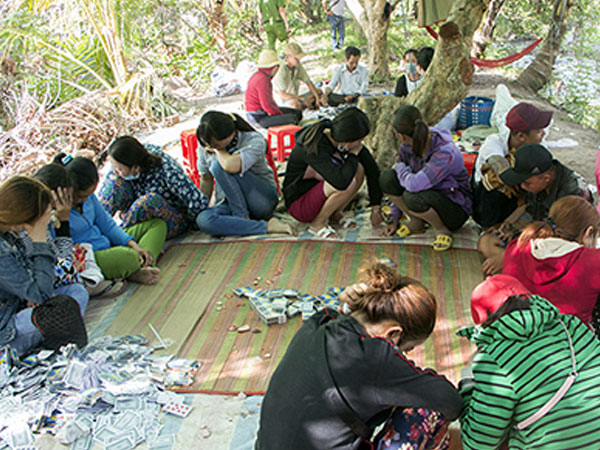 Công an ở Vĩnh Long chiều 19/6 đã ập vào vườn trái cây của hộ dân tại huyện Long Hồ, bắt quả tang hàng chục phụ nữ đang đánh bài ăn tiền.