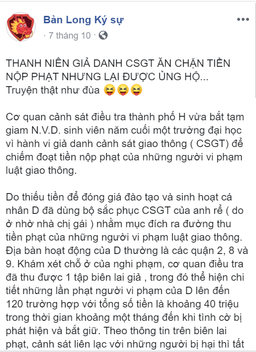 "Sau khi được cơ quan cảnh sát thông báo đó là CSGT giả thì nhiều người đã vô cùng bất ngờ và bối rối. Và điều đặc biệt là không ai ký vào lá đơn tố cáo D.", đoạn cuối bài viết còn cho biết nhiều người cảm thấy vui khi bị đối tượng giả danh CSGT xử phạt.