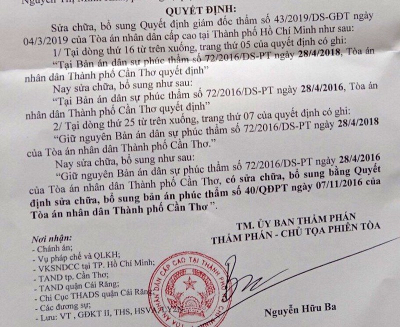 Ngày 7-7, sau hơn hai năm xử giám đốc thẩm vụ tranh chấp di sản thừa kế, Ủy ban Thẩm phán TAND Cấp cao tại TP.HCM ban hành Quyết định 03 về việc sửa chữa, bổ sung quyết định giám đốc thẩm do “có lỗi về chính tả”.