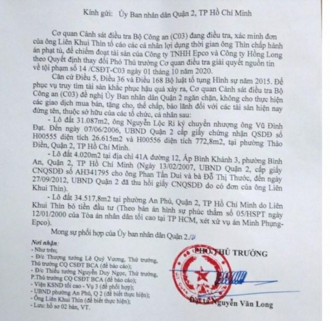 Ngày 29/6/2021 Cơ quan Cảnh sát điều tra Bộ Công an đã có văn bản thông báo về việc khởi tố vụ án và có ngăn chặn giao dịch, chuyển nhượng đối với 3 lô đất, trong đó có lô đất vàng 3 ha tại phường Thảo Điền (TP Thủ Đức).