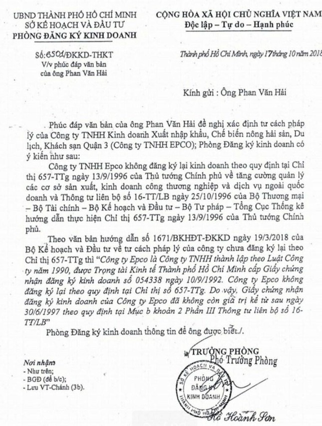 Theo Sở Kế hoạch và Đầu tư TPHCM, giấy chứng nhận đăng ký kinh doanh và con dấu của công ty Epco không còn giá trị từ sau ngày 30/6/1997. Tuy nhiên, ông N.L.R vẫn xưng danh…giám đốc và đóng dấu công ty Epco trên các hợp đồng chuyển nhượng quyền sử dụng đất.