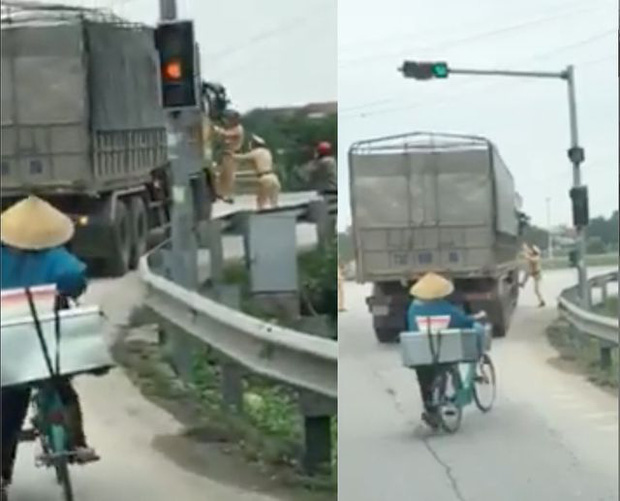 Ngay lập tức, 2 cán bộ CSGT đã nhảy lên bám vào cánh cửa bên phải xe tải, yêu cầu tài xế dừng xe nhưng bất thành. Lực lượng CSGT sau đó đã phải sử dụng xe chuyên dụng đuổi theo và chặn thành công chiếc xe tải vi phạm.