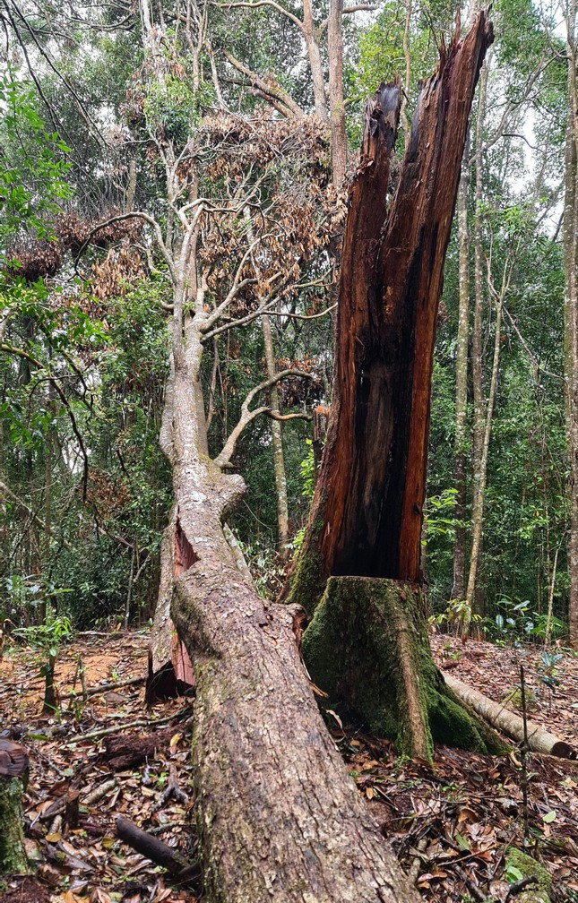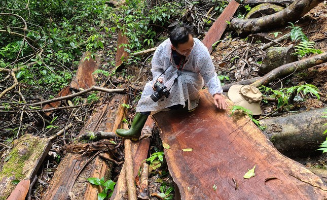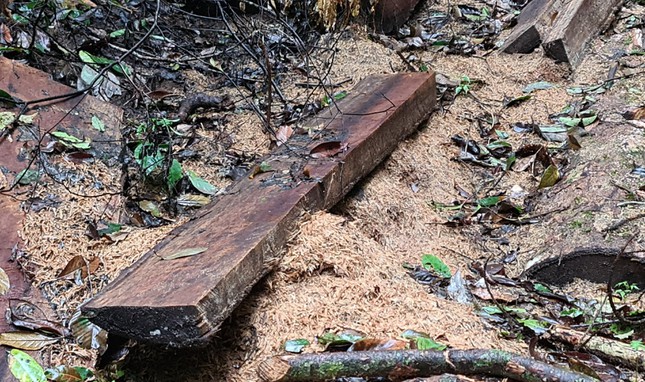 Tại hiện trường, các cây dổi cổ thụ, đường kính từ 1,2 - 1,5m bị cưa hạ nằm ngổn ngang, cắt ra từng khúc để xẻ thành ván. Nhiều cây mới bị chặt, gỗ vẫn còn tươi; nhiều khúc gỗ vẫn chưa kịp đưa ra khỏi rừng; một số can nhựa chứa xăng, nhớt bị bỏ lăn lóc trên mặt đất.