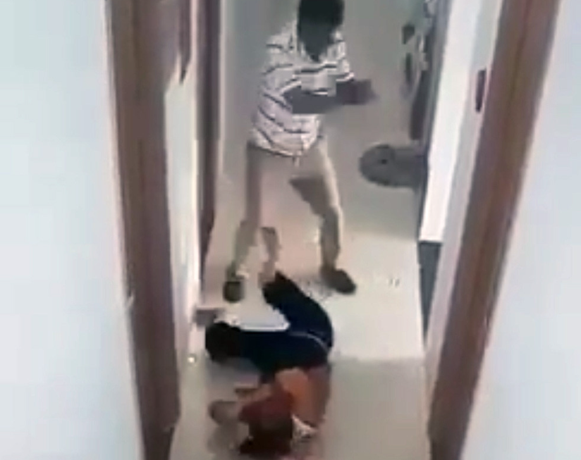 Theo hình ảnh camera an ninh ghi lại, ông Xuân cầm cây gỗ đánh liên tục vào tay, chân, đầu của chị T. ngay tại lối đi của khách sạn.