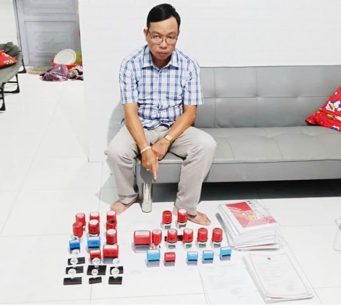 Ngày 4/12, Công an huyện Vĩnh Thạnh (Đồng Tháp) cho biết đã tạm giữ hình sự ông Nguyễn Phúc Bình (41 tuổi, ngụ xã Đồng Sơn) để điều tra hành vi làm giả con dấu, tài liệu của cơ quan, tổ chức sau khi đơn vị phát hiện số lượng lớn giấy tờ nghi làm giả tại nơi ở và nơi làm việc của người này.