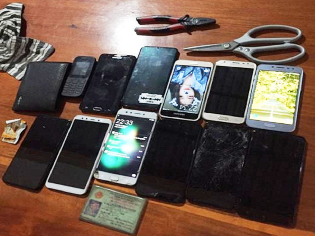 Qua kiểm tra, phát hiện trong túi đựng đồ của Thẩm có 1,2 triệu đồng và 11 điện thoại di động các nhãn hiệu, cùng nhiều vật dụng như kìm, kéo, lưỡi lam... Tổng trị giá khoảng hơn 18 triệu đồng.