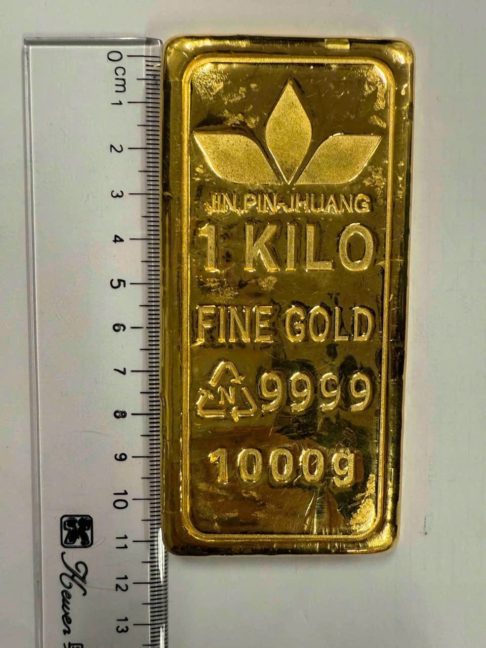 Tiến hành kiểm tra, phát hiện trong túi quần sau bên phải của hành khách này có 01 miếng kim loại màu vàng, kích thước dài khoảng 11.5 cm, rộng khoảng 5.5 cm, dày khoảng 0.8 cm, khối lượng khoảng 01 kg. Trên miếng kim loại có khắc dòng chữ “JIN, PIN-JHUANG 1 KILO FINE GOLD 9999 1000g”.