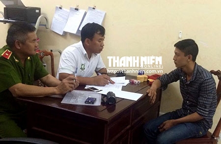 | Nguyễn Hải Dương (bìa phải) lúc vừa bị bắt và lấy lời khai ban đầu - Ảnh: CA |