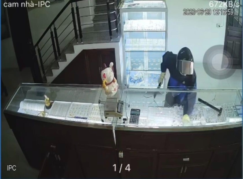 Lúc này, con gái chủ tiệm vàng nhìn thấy 1 đối tượng mặc quần áo màu đen, đội mũ bảo hiểm kín đầu, đeo găng tay cầm theo búa đang đập kính lấy trộm vàng bỏ vào túi. Phát hiện chị N. đi lên quầy bán vàng của gia đình, đối tượng cướp vàng đã cầm dao dọa chém. Chị N. lúc này tri hô cướp, nghi phạm sợ bị lộ đã nhanh chóng tẩu thoát bằng xe máy dựng ngoài đường.