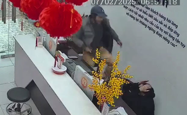 Ngay khi mở cửa, tên này rút dao nhọn, đẩy nữ nhân viên ngã xuống sàn, tay còn lại vung dao định gây sát thương.