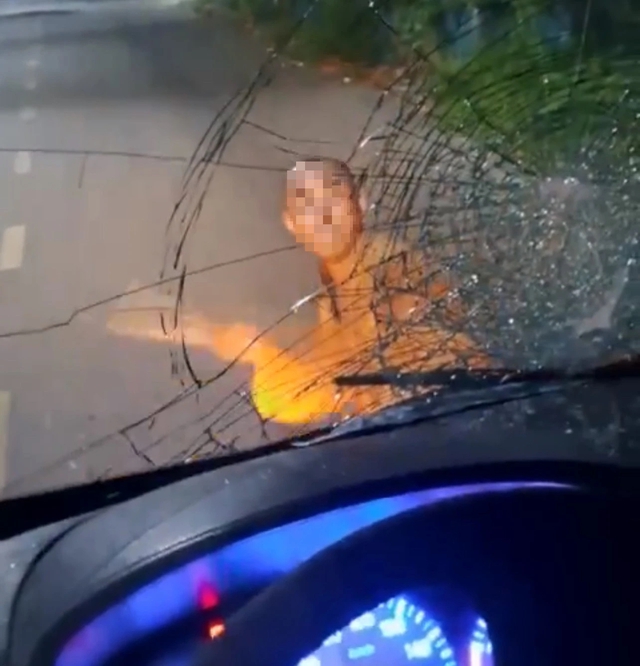 Theo hình ảnh được ghi lại, người đàn ông trọc đầu, mặc trang phục giống nhà sư đã dùng một vật cứng, đập liên tục vào kính chắn gió phía trước cabin xe tải.
