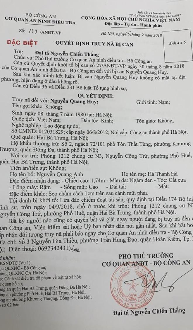 Căn cứ các tài liệu thu thập, ngày 30-8/-018, Cơ quan ANĐT đã ra quyết định khởi tố vụ án, khởi tố bị can đối với Nguyễn Quang Huy để điều tra về hành vi "Lừa đảo chiếm đoạt tài sản". Do Nguyễn Quang Huy bỏ trốn, ngày 5-9-2018, Cơ quan ANĐT đã ra Quyết định truy nã bị can đối với Nguyễn Quang Huy.