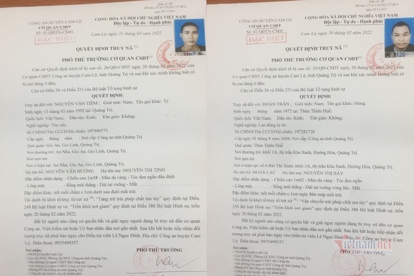 Hai đối tượng bị truy nã là Nguyễn Văn Tiềm (SN 1992, trú ở thôn An Nha, xã Gio An, huyện Gio Linh) và Đoàn Trân (SN 1972, trú tại Khối 3A, thị trấn Khe Sanh, huyện Hướng Hoá).