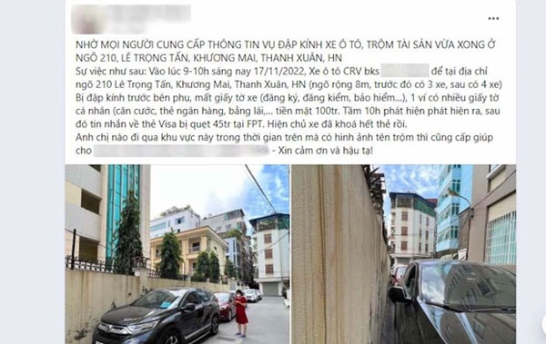 Chiều 17/11, báo Giao thông dẫn lời Thượng tá Đinh Tuấn Thành, Trưởng Công an quận Thanh Xuân, Hà Nội cho biết, đơn vị đang vào cuộc điều tra vụ một người đăng tin lên mạng xã hội bị kẻ gian đập kính ô tô, lấy trộm 100 triệu đồng.