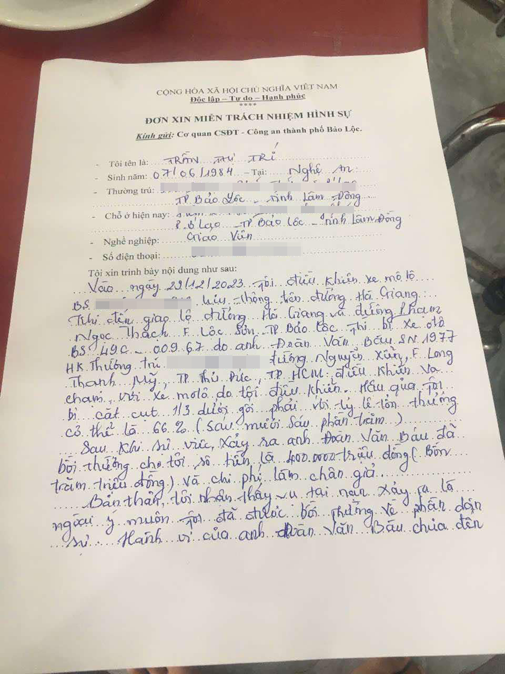 Trước đó ngày 22/1/2024 bà Trí cũng có đơn bãi nại gửi đến Cơ quan CSĐT Công an TP Bảo Lộc để xin miễn trách nhiệm hình sự cho ông Đoàn Văn Báu.