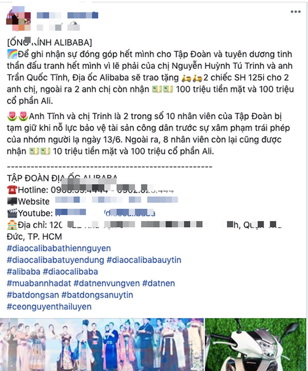 Ngày 17/6, giữa tâm bão của dư luận, trên fanpage công ty địa ốc Alibaba đã có bài đăng về việc treo quà khủng cho sự đóng góp nhiệt tình của 2 nhân viên… vừa bị cơ quan chức năng tạm giữ hình sự.