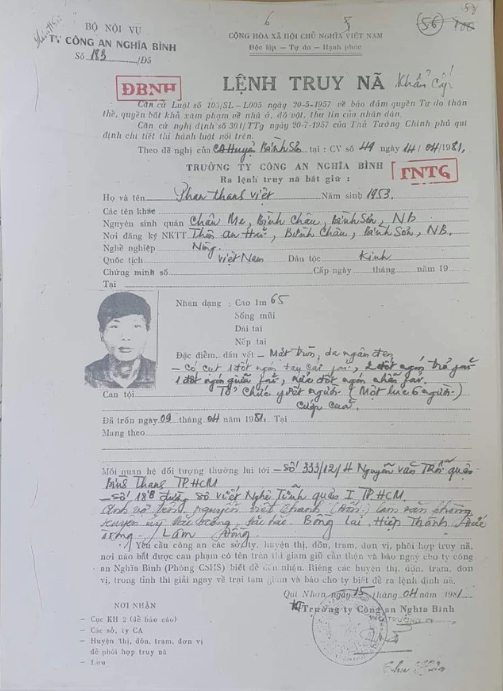 Việt bị truy nã về hành vi cùng đồng bọn giết 6 người, cướp tài sản trong vụ án xảy ra cách đây 43 năm trước.