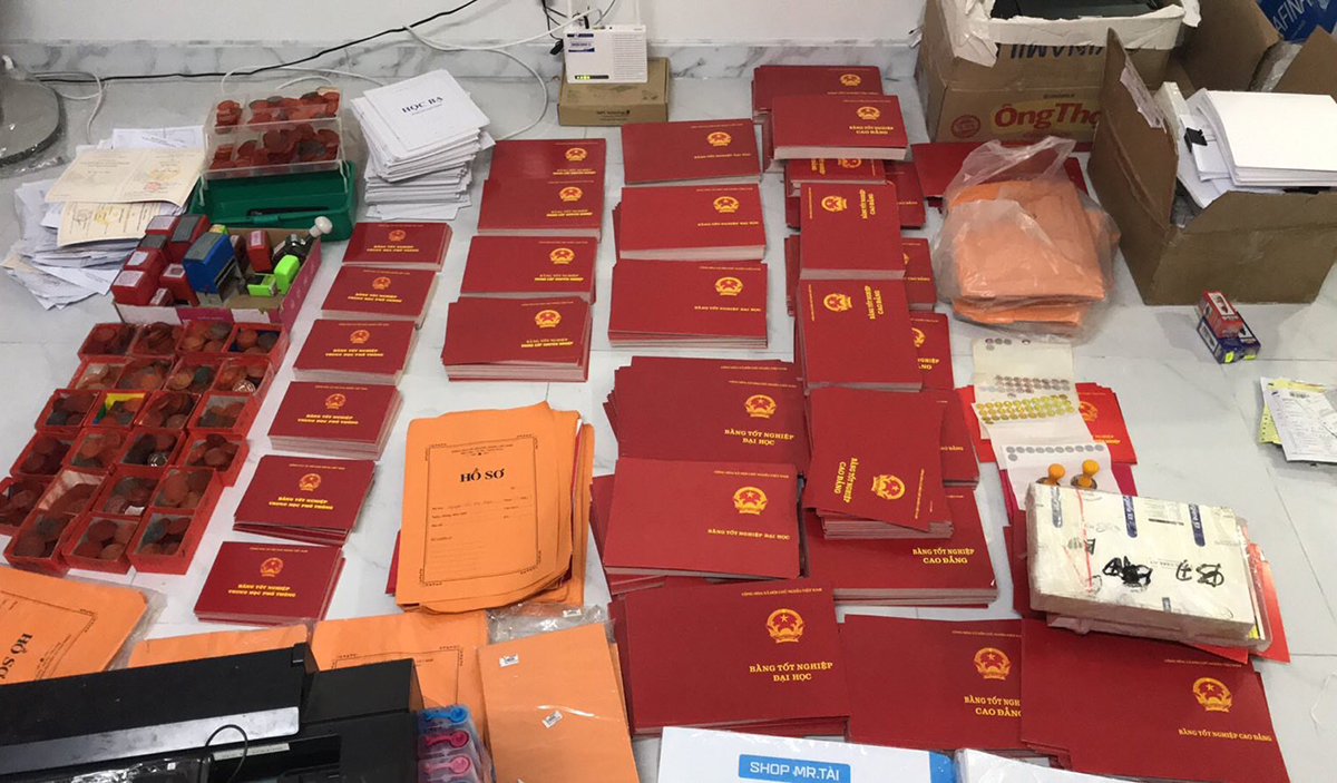 Khám xét nhà 3 nghi can tại quận 12 và Gò Vấp, cơ quan điều tra thu giữ 4 máy tính chứa các dữ liệu thiết kế, cùng nhiều thiết bị in phôi giấy tờ giả, làm con dấu. Trong số 3600 phôi bằng các loại (Đại học, Cao đẳng, trung cấp chuyên nghiệp, trung học phổ thông) cơ quan chức năng phát hiện nhiều bằng bác sỹ y khoa, đại học sư phạm đã được in sẵn tên, chưa kịp chuyển cho người mua.