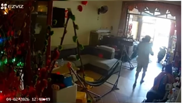 Theo hình ảnh từ camera, khoảng 12h40 ngày 2/4, một thanh niên đeo khẩu trang, mặc áo khoác đỏ, đội mũ bảo hiểm đi xe máy đến trước một căn nhà trên đường Trần Bình Trọng, phường Tam Thắng (TP.HCM).