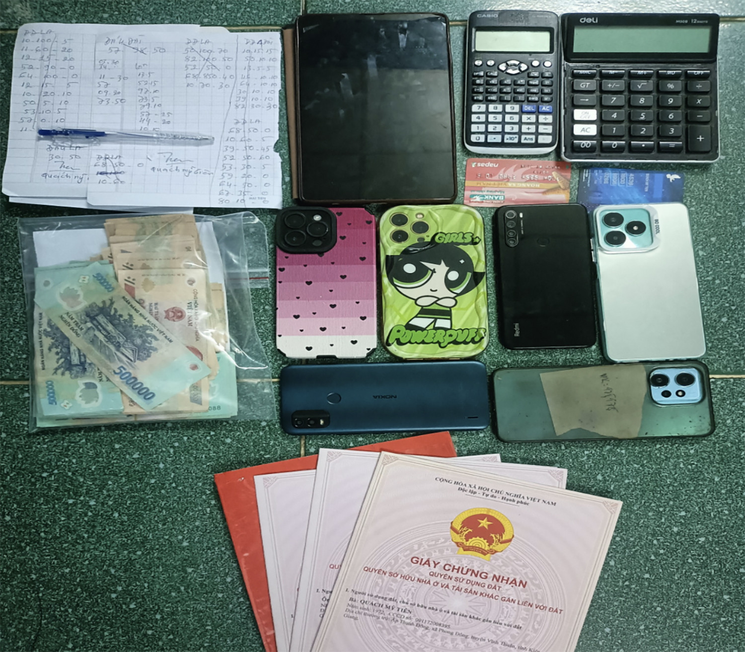 Thời điểm bị bắt giữ, tang vật thu được gồm 9 điện thoại di động, 5 máy tính bảng, 1 đầu thu camera, nhiều giấy tờ ghi đề. Số tiền giao dịch đánh bạc trên không gian mạng là 156 triệu đồng. Ngoài ra, khám xét trên người và nơi ở của các đối tượng, lực lượng chức năng đã thu giữ thêm 150 triệu đồng.