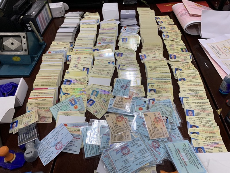 Khám xét nơi ở và làm việc của các đối tượng, cảnh sát thu giữ hơn 100 mẫu con dấu giả của các cơ quan, tổ chức cùng nhiều máy vi tính, điện thoại, thiết bị máy in màu, máy scan, máy dập chữ, máy in thẻ nhựa, máy ép nhiệt, phôi bằng… cùng hàng ngàn các loại giấy tờ, chứng từ giả như giấy phép lái xe, giấy chứng nhận đăng ký xe mô tô, ôtô; giấy chứng nhận đăng kiểm, tem kiểm định; biển số xe; giấy CMND, CCCD; giấy chứng nhận quyền sử dụng đất và các tài sản trên đất; các loại bằng cấp, chứng chỉ của các trường và một số lượng lớn vàng, tiền của nhiều quốc gia.