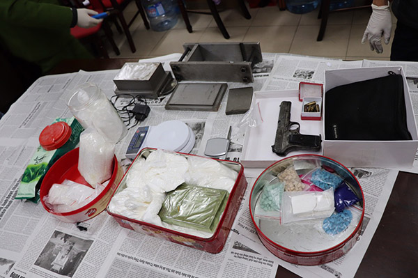 Tang vật lực lượng Công an thu giữ gồm 12 bánh heroin; 860,77 gam Ketamine; 248,83 gam Methamphetamine; 1 khẩu súng K54; 7 viên đạn; 1.874,24 gam chất bột màu trắng (nghi là heroin) đang giám định; 185,41 gam tinh thể màu trắng (đang giám định); 125,13 gam các viên nén (đang giám định); 1 cân đĩa, 2 cân điện tử đính heroin; 2 khuôn ép bánh heroin; 1 máy ép thủy lực; cùng nhiều dụng cụ dùng để nghiền, ép và bọc các bánh heroin thành phẩm; 200 triệu đồng và các tài liệu, vật chứng khác có liên quan.