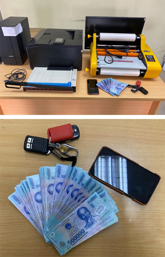 Cơ quan CSĐT Công an huyện Thanh Trì đã tiến hành khám xét khẩn cấp chỗ ở của Đỗ Văn Long tại số 7A ngõ 2 Phúc La, P. Phúc La, Hà Đông, Hà Nội. Qua khám xét thu giữ một chiếc điện thoại di động màu đen, 4 tờ giấy khổ A4 có in hình tiền Việt Nam đồng mệnh giá 500.000 đồng có số seri KX12736009...