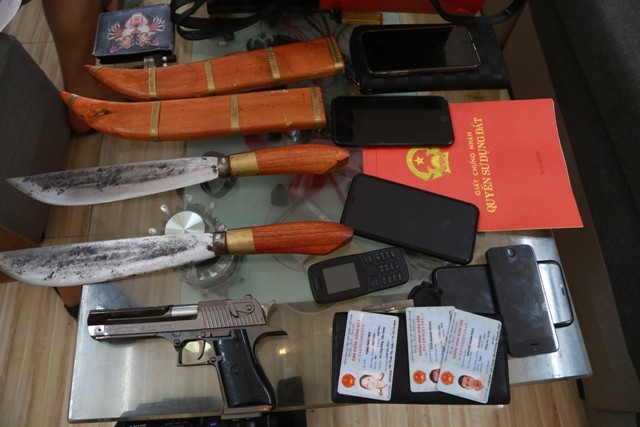 Tại đây, cơ quan chức năng đã phát hiện và thu giữ số tiền hơn 100 triệu đồng; 4 thùng đựng sổ sách, tài liệu thể hiện việc cho vay tiền; 2 con dao kim loại dài khoảng 50cm; 2 đùi sắt; 1 khẩu súng nhựa được các đối tượng dùng để đe dọa đòi nợ và 1 xe máy trộm cắp.