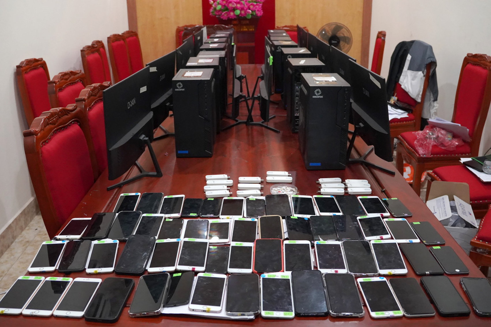 Tại nơi các đối tượng hoạt động, Công an TP Hạ Long thu giữ 15 bộ máy tính để bàn, 52 chiếc điện thoại và 100 sim điện thoại các loại.