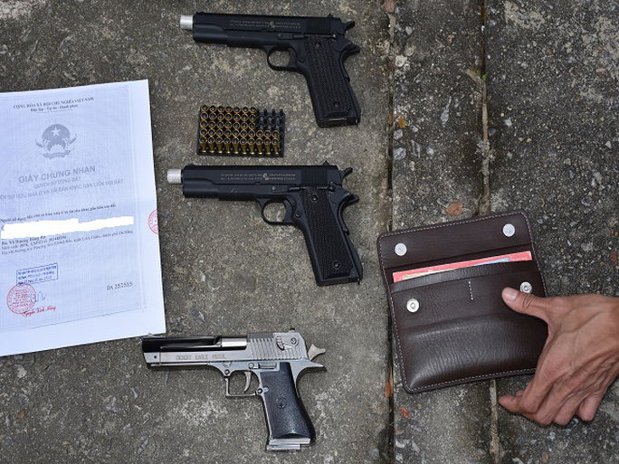 Khám xét khẩn cấp phương tiện, nơi ở của các đối tượng này, công an thu giữ 3 khẩu súng (2 súng bắn đạn cao su, 1 súng giả), 51 viên đạn, 1 bình xịt hơi cay, nhiều mã tấu, gậy gỗ, 2 ôtô, 8 điện thoại di động, 2.000 USD, 116 triệu đồng, nhiều giấy tờ vay mượn và các đồ vật, tài liệu liên quan.