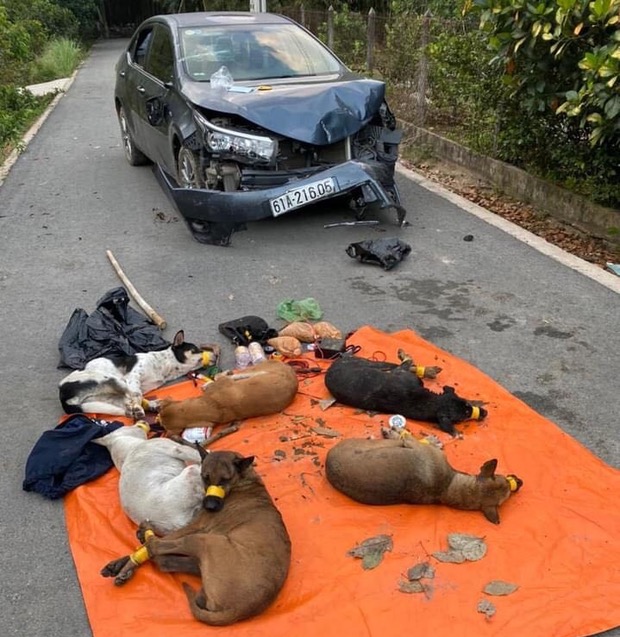 Qua kiểm tra, công an phát hiện trên xe 7 con chó, 1 súng xung điện, bột ớt, băng keo, gậy 3 khúc. Ngoài ra, phía ghế sau xe còn có 1 nón keppi của ngành Công an.