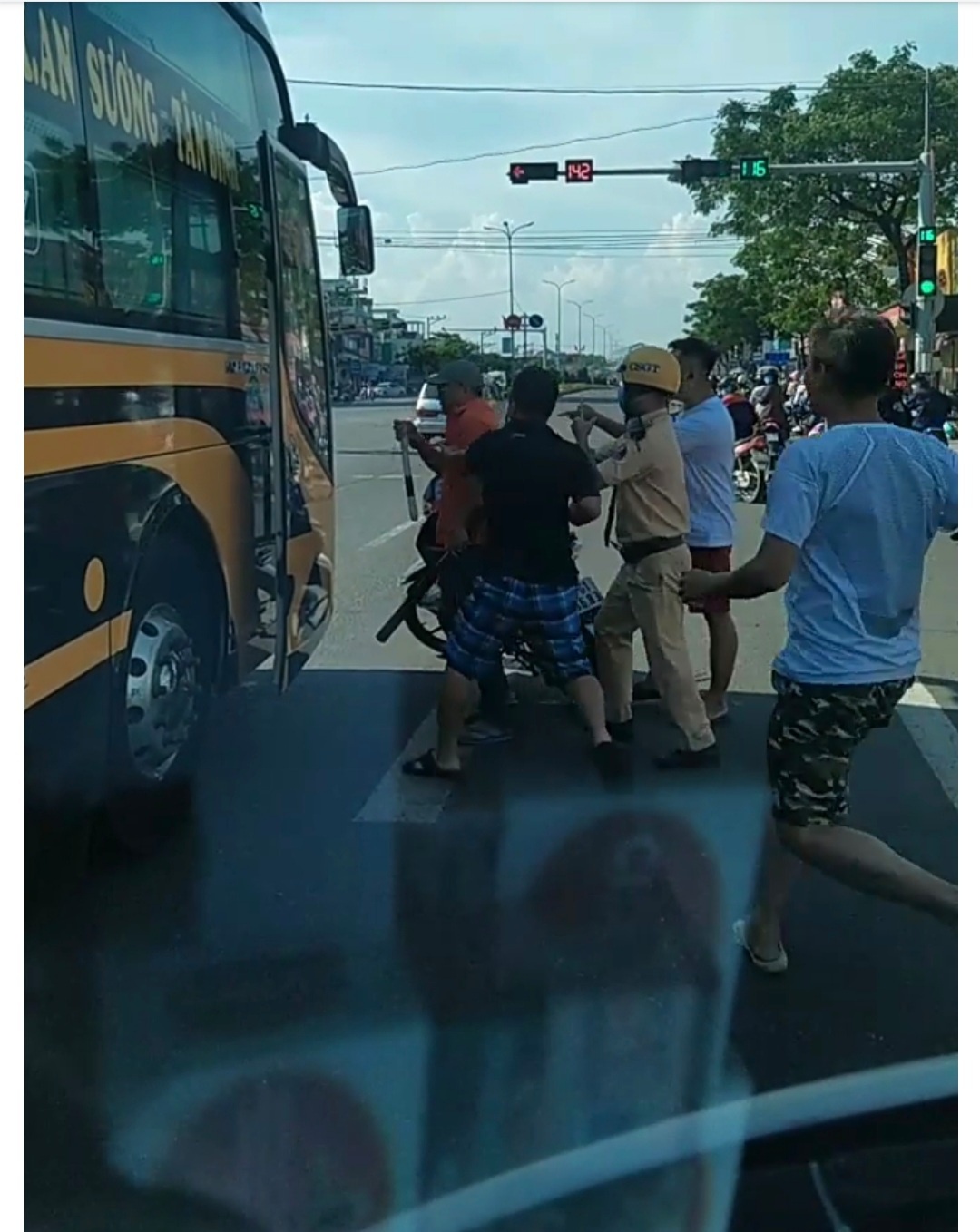 Lái xe đánh trung úy CSGT rồi bỏ chạy lên xe nhưng bị nhóm thanh niên đi đường giữ lại. ẢNH: NGUYỄN LONG