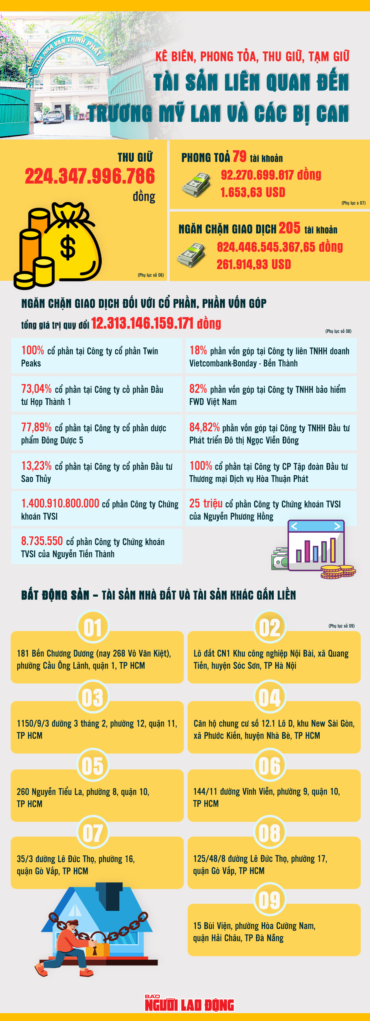 Ở giai đoạn 2 vụ án xảy ra tại Tập đoàn Vạn Thịnh Phát, cơ quan điều tra đã ra lệnh phong tỏa, kê biên khối tài sản liên quan Trương Mỹ Lan và các bị can khác.