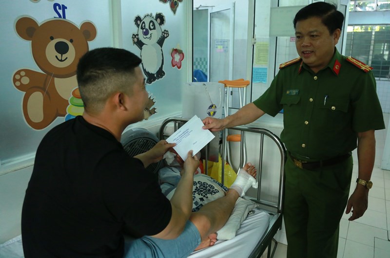 Chiều 8/7, Đại tá Trần Phước Hương – Trưởng Công an quận Hải Châu (TP Đà Nẵng) đã đến thăm, động viên Trung úy Trương Huỳnh Văn sau tai nạn vì truy đuổi tội phạm.