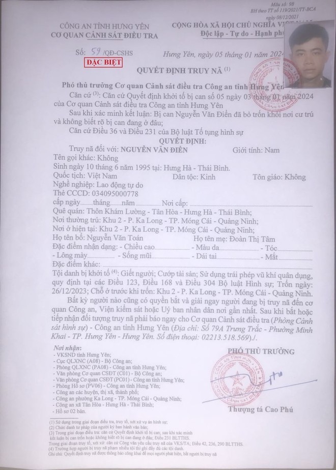 09/01/2024 16:59Truy nã đặc biệt 'sát thủ' trong vụ dựng màn kịch cướp 8 tỷ đồng ở Hưng Yên