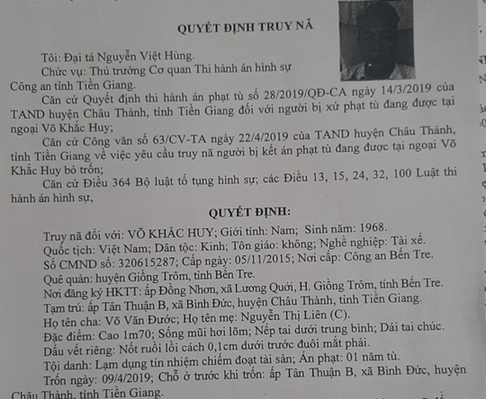 Ngày 9-3, Cơ quan Thi hành án Hình sự Công an tỉnh Tiền Giang cho biết vừa ra quyết định truy nã Võ Khắc Huy (SN 1968; tạm trú xã Bình Đức, huyện Châu Thành, tỉnh Tiền Giang).