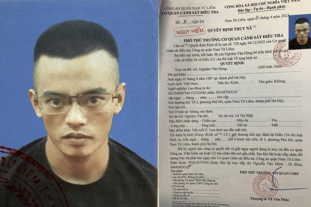 Ngày 3/8, thông tin từ Cơ quan CSĐT Công an quận Nam Từ Liêm cho biết: Lực lượng chức năng đã ra Quyết định truy nã đối tượng Nghiêm Văn Hùng (SN 1987; trú tại phường Phú Đô, quận Nam Từ Liêm, TP Hà Nội) về tội Cố ý gây thương tích.