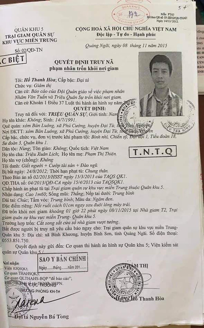 Trước lúc bỏ trốn, Triệu Quân Sự đang thụ án Chung thân về các tội “Giết người”, “Cướp tài sản”, “Đào ngũ” và “Trốn khỏi nơi giam”.