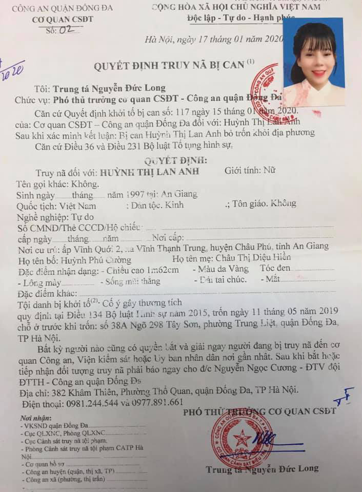 Ngày 17/1/2020, Cơ quan CSĐT Công an quận Đống Đa ra Quyết định truy nã bị can đối với Huỳnh Thị Lan Anh.