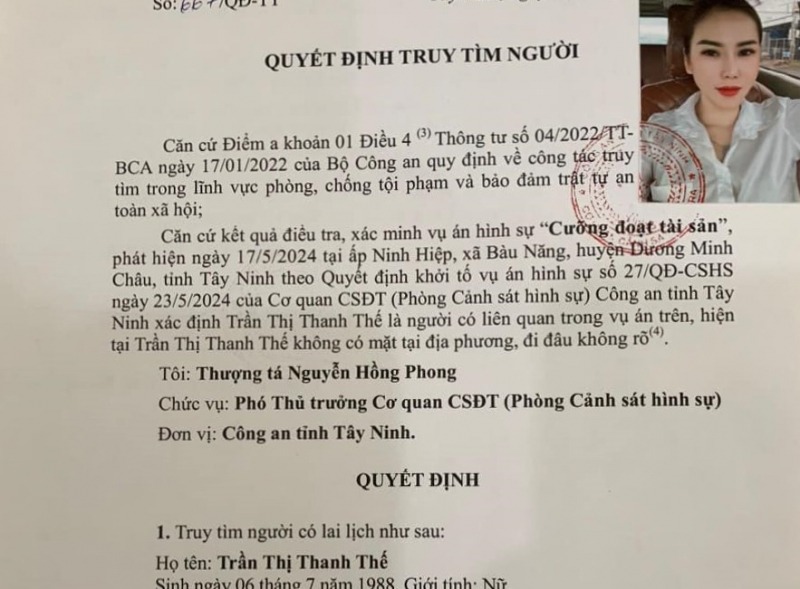 Cụ thể, căn cứ kết quả điều tra, xác minh vụ án hình sự cưỡng đoạt tài sản vào ngày 17/5, tại ấp Ninh Hiệp, xã Bàu Năng, huyện Dương Minh Châu, theo quyết định khởi tố vụ án hình sự số 27/QĐ-CSHS ngày 23/5 của Cơ quan CSĐT Công an tỉnh Tây Ninh xác định, Thế là người có liên quan trong vụ án trên. Hiện, Thế không có mặt tại địa phương và đi đâu không rõ.