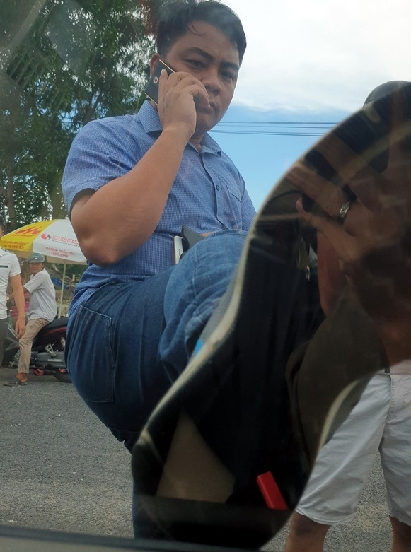 Do sợ xuống xe sẽ bị ây sự nên những người ngồi trên xe không xuống. Lúc này, Giang, Đạt, Thái và một số nam giới xăm trổ khác đến nơi.