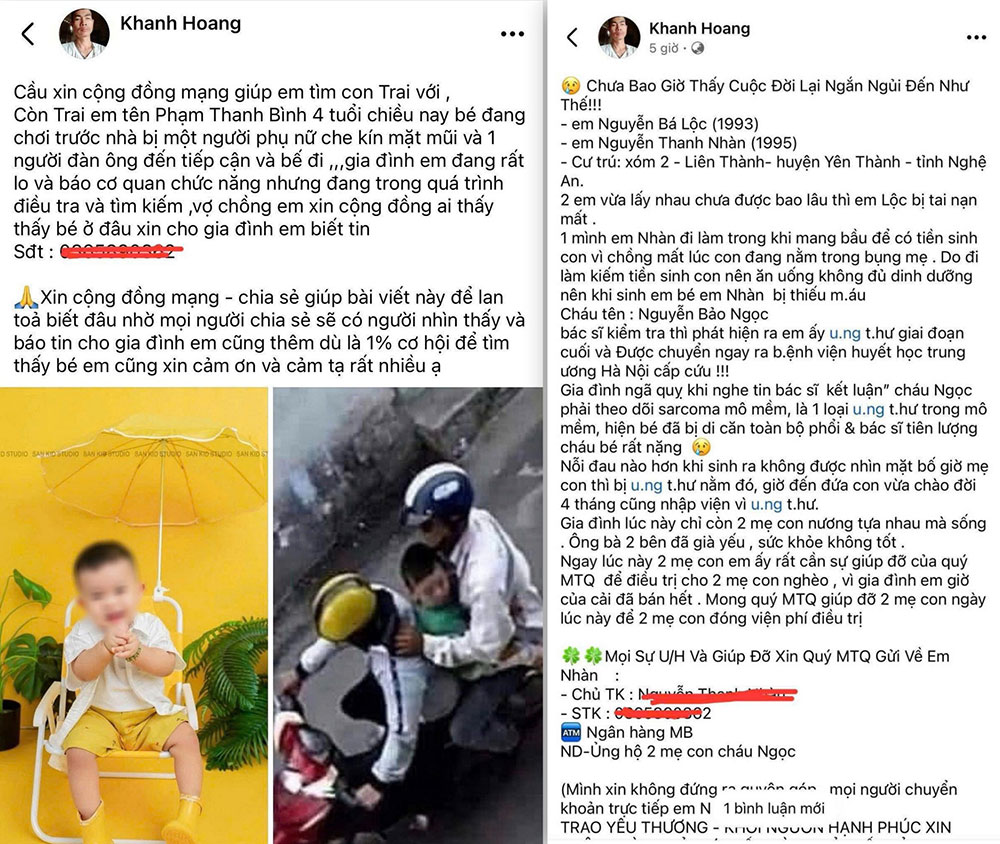 Thông tin trên Công an Nghệ An cho biết mới đây một trang cá nhân Facebook có tên “Khanh Hoang” sau khi đăng tải thông tin tìm con bị bắt cóc đã thu hút hàng chục nghìn lượt chia sẻ. Nhưng chỉ vài giờ sau, bài viết này được chỉnh sửa thành nội dung khác để kêu gọi người dân chuyển khoản làm từ thiện. Cụ thể, chủ trang cá nhân Facebook nói trên đã có bài đăng về một bé trai 4 tuổi bị bắt cóc trước cửa nhà, kêu gọi cộng đồng mạng trợ giúp tìm kiếm.