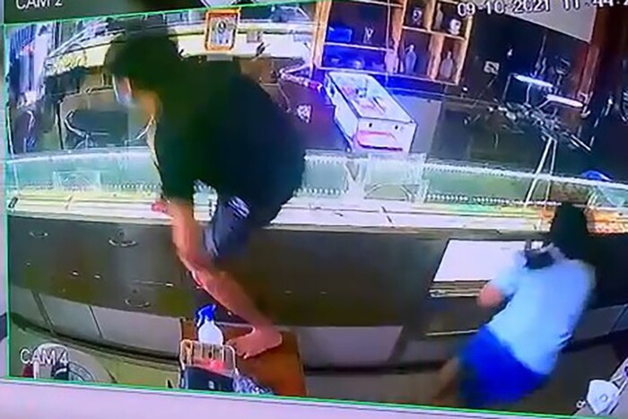 Tại tiệm vàng này, nam thanh niên cầu nữ chủ tiệm vàng đưa ra hai sợi dây chuyền để chọn lựa. Lúc này, thanh niên vờ ngắm nghía rồi cầm vàng bỏ chạy.