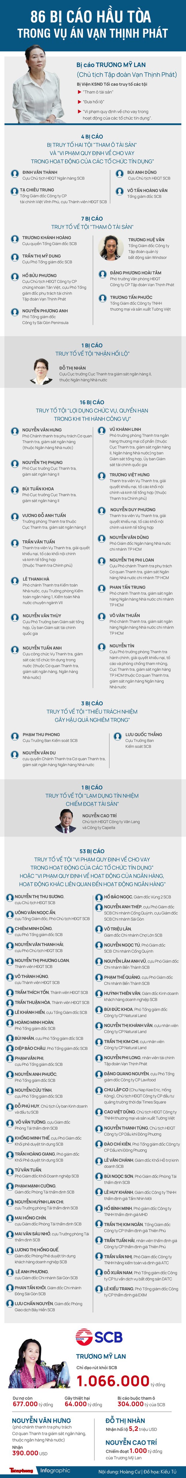Trong chiều 6/3, đại diện viện kiểm sát tiếp tục công bố cáo trạng truy tố bị cáo Trương Mỹ Lan (68 tuổi, cựu Chủ tịch HĐQT Tập đoàn Vạn Thịnh Phát) cùng 85 đồng phạm liên quan sai phạm xảy ra tại Tập đoàn Vạn Thịnh Phát, Ngân hàng TMCP Sài Gòn (SCB) và các đơn vị liên quan.