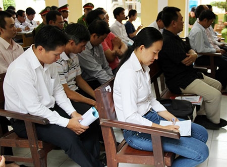Các bị cáo nghe và ghi chép để tiếp tục đối đáp lại với đại diện cơ quan công tố vào chiều 29/7. Ảnh: Việt Tường. |